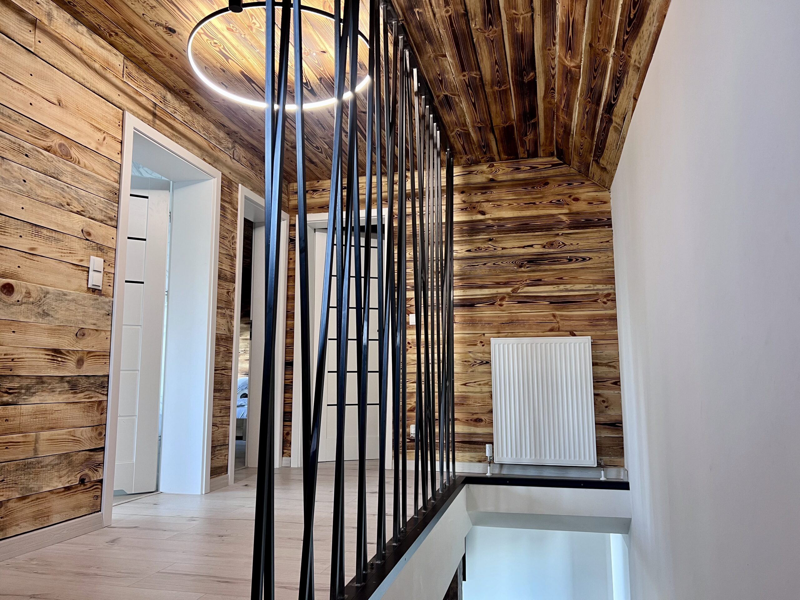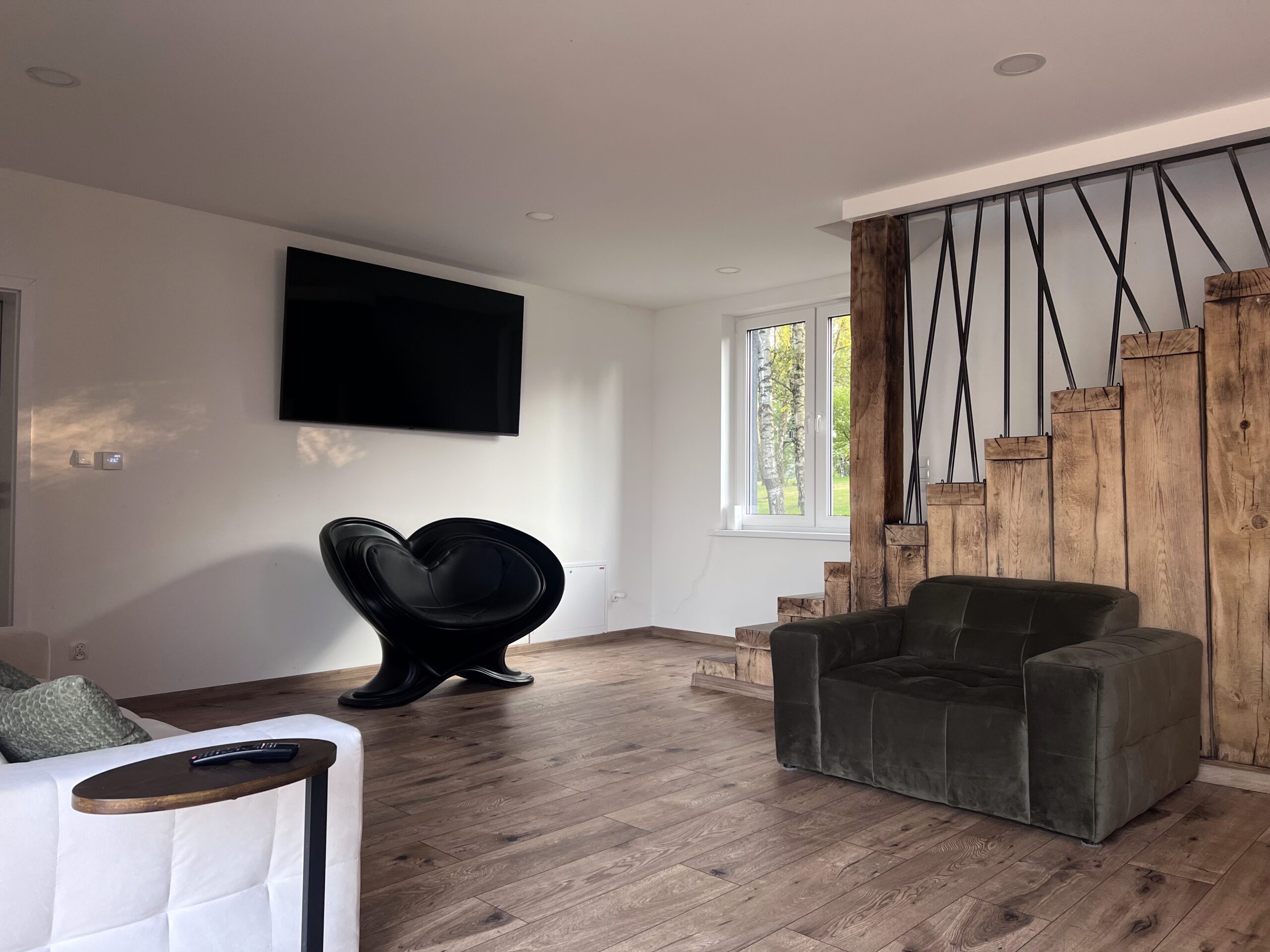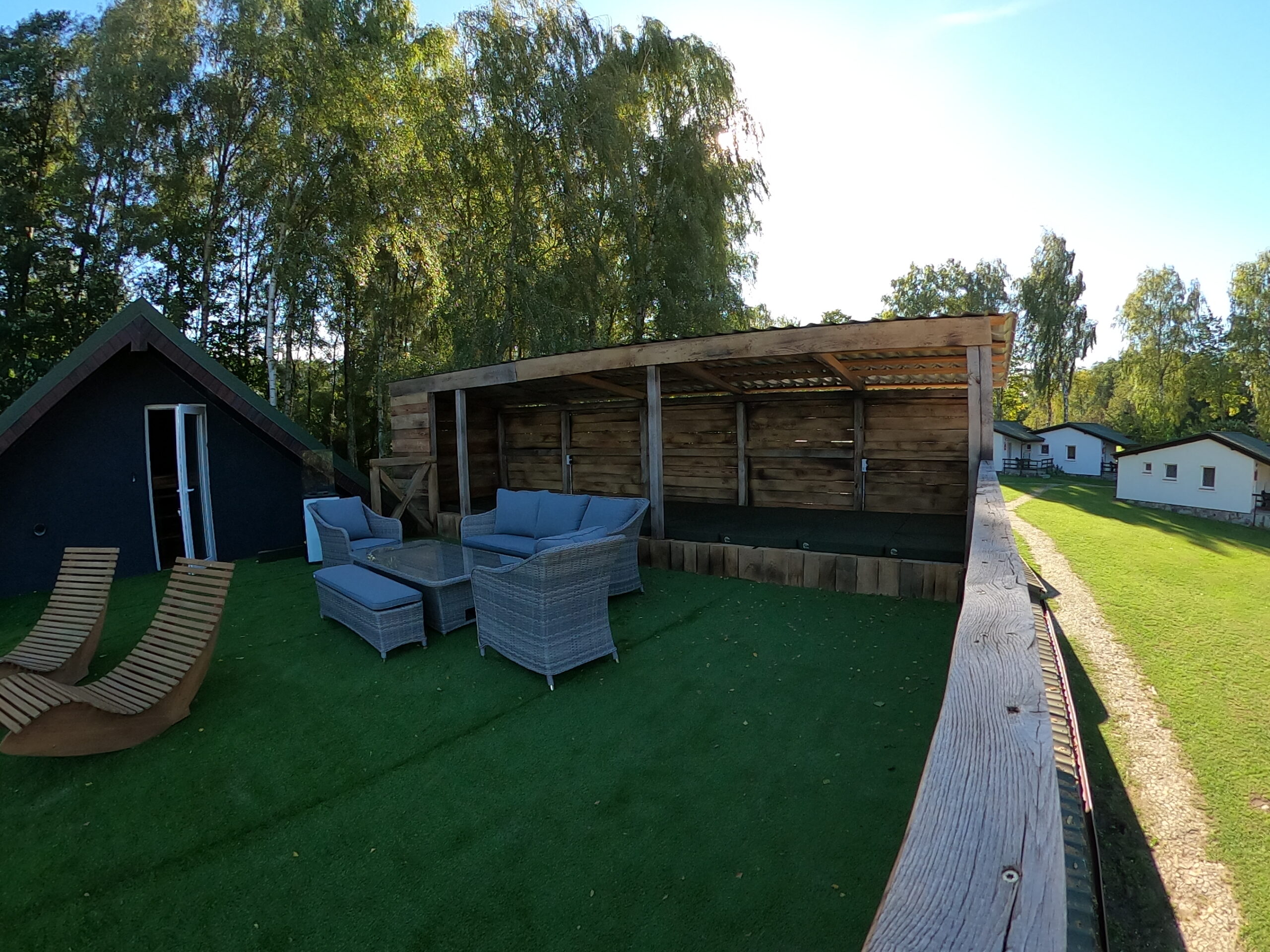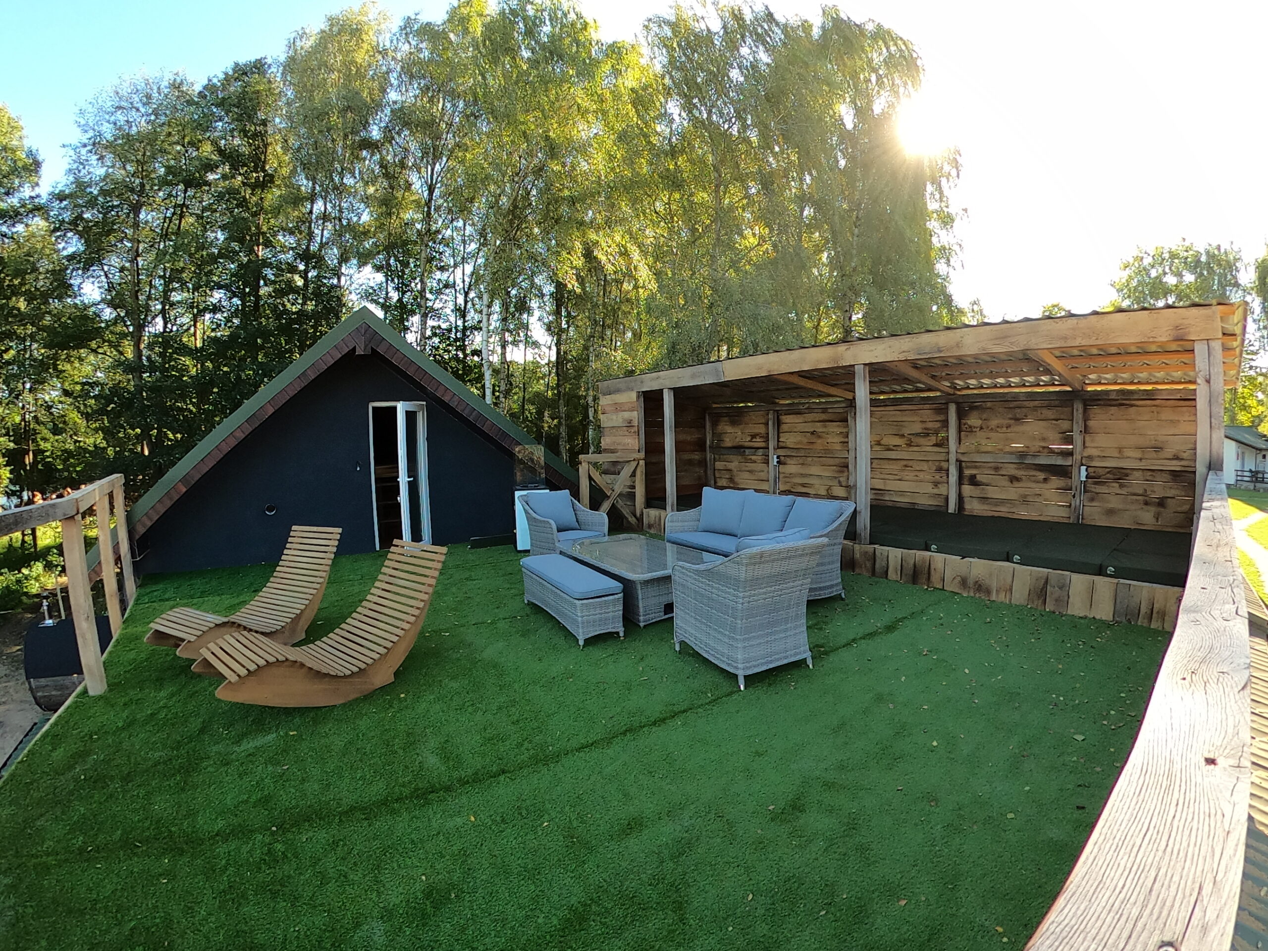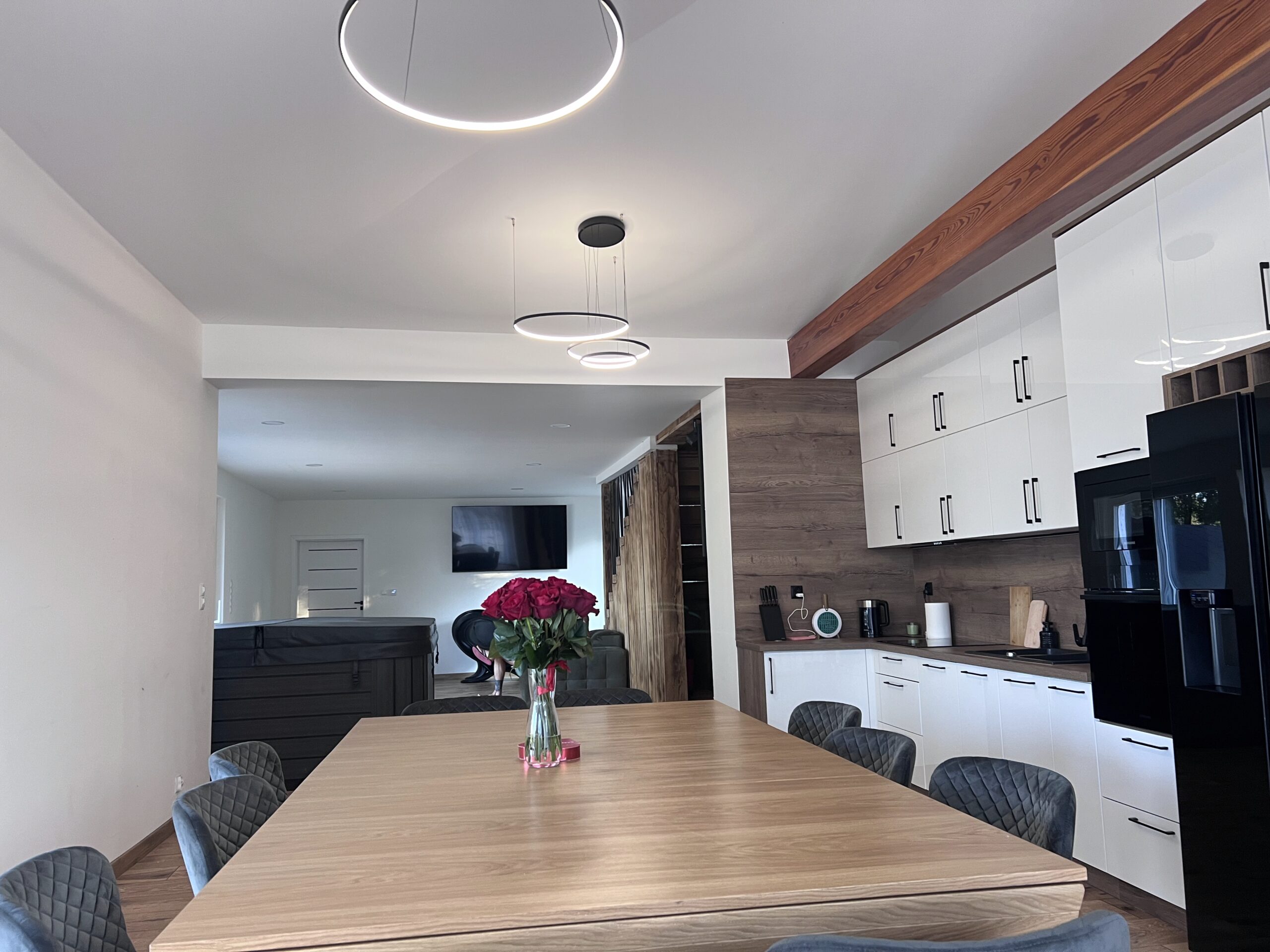 Na drugim piętrze znajduje się taras z leżakami oraz zadaszoną strefą wypoczynkową – idealną o każdej porze roku. Przestronna kuchnia i jadalnia sprzyjają wspólnemu gotowaniu i biesiadowaniu, a liczne strefy relaksu zapraszają zarówno do odpoczynku, jak i do zabawy w gronie przyjaciół. Ten apartament to idealny wybór dla rodzin z dziećmi, grup znajomych szukających miejsca na niezapomniany pobyt oraz par pragnących zanurzyć się w luksusie i romantycznej atmosferze nad jeziorem Wisola.