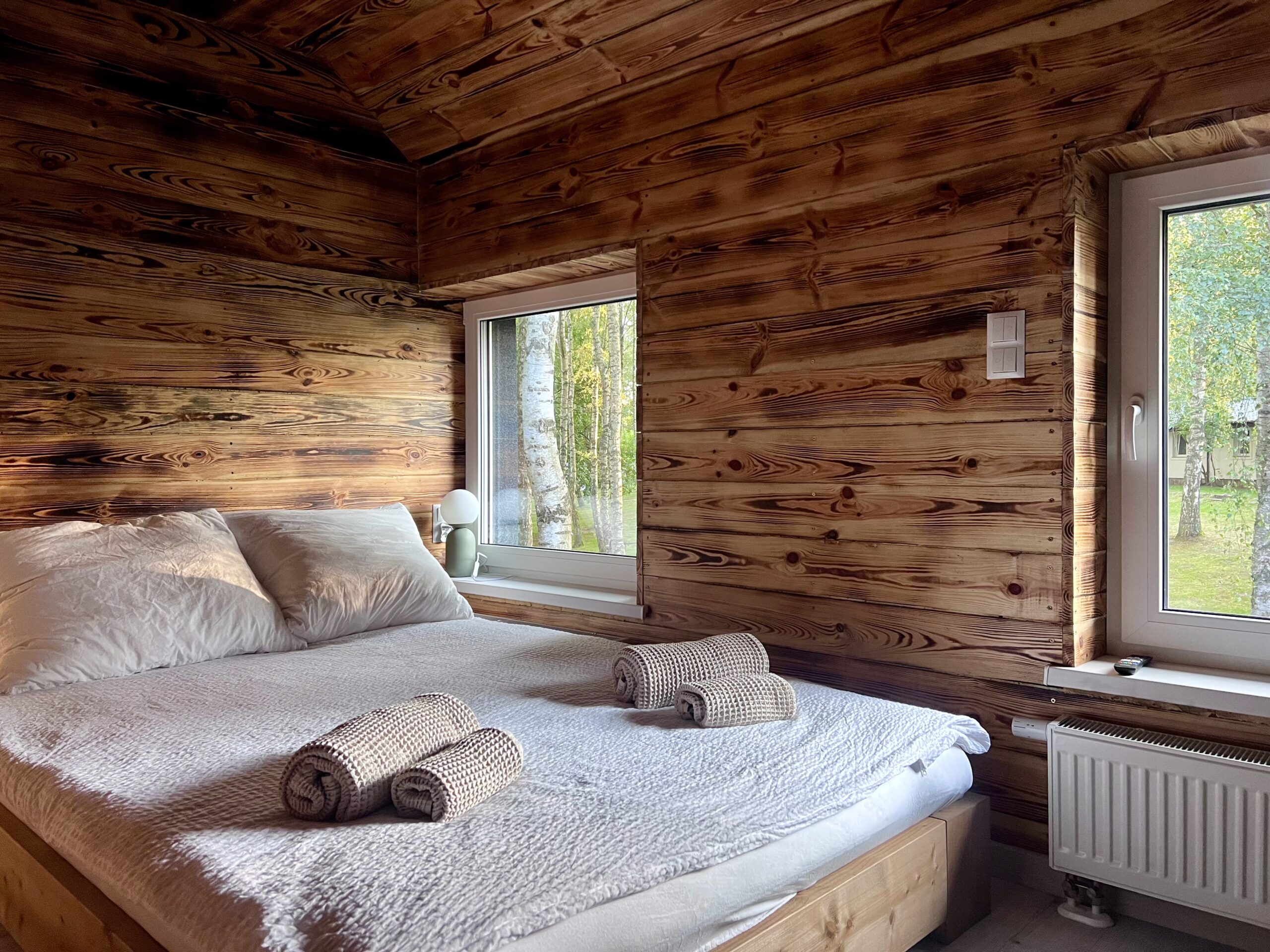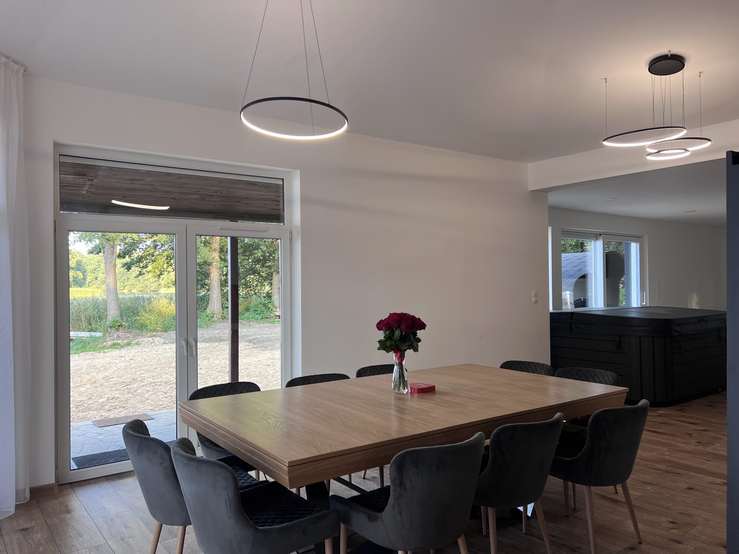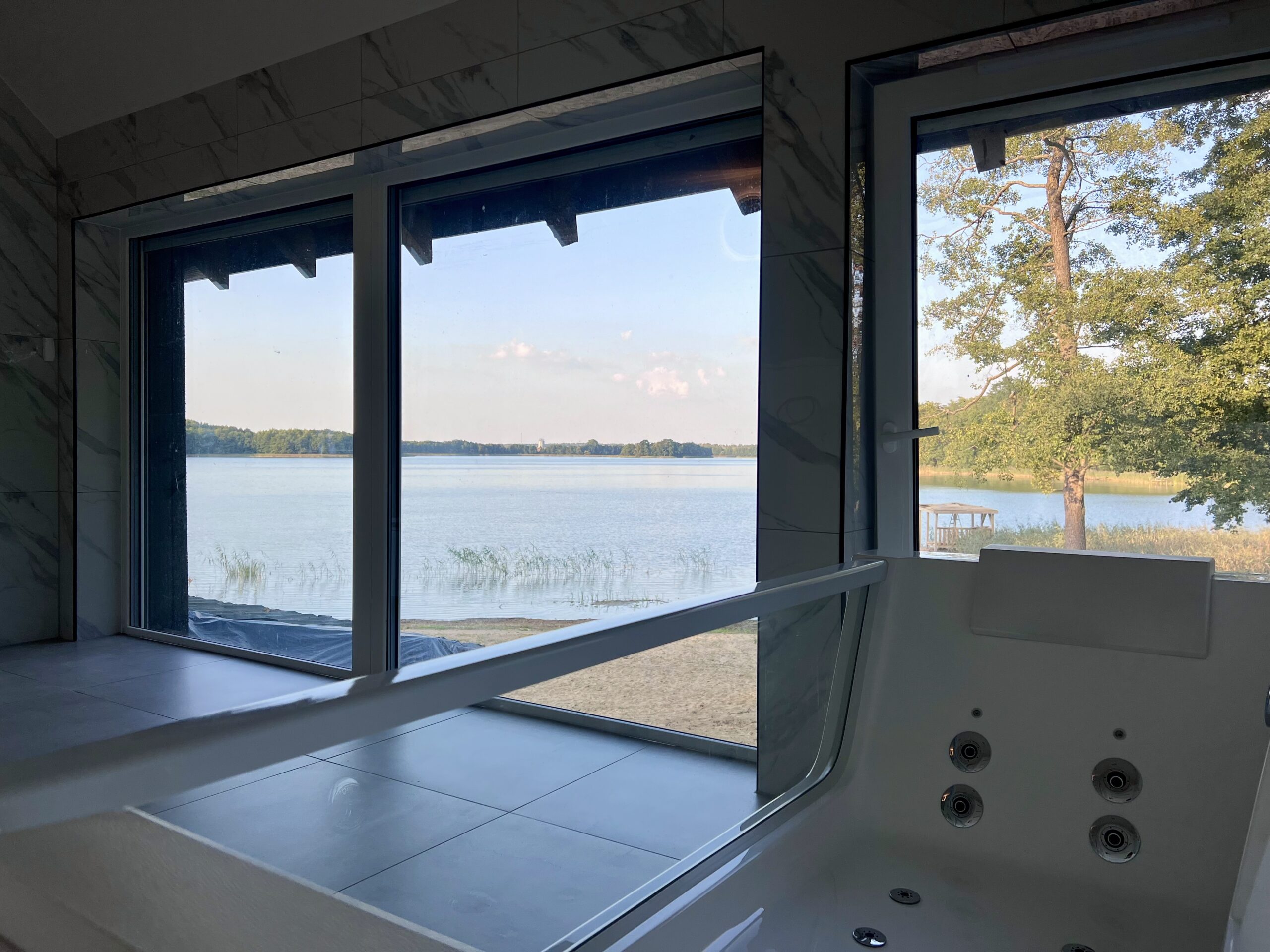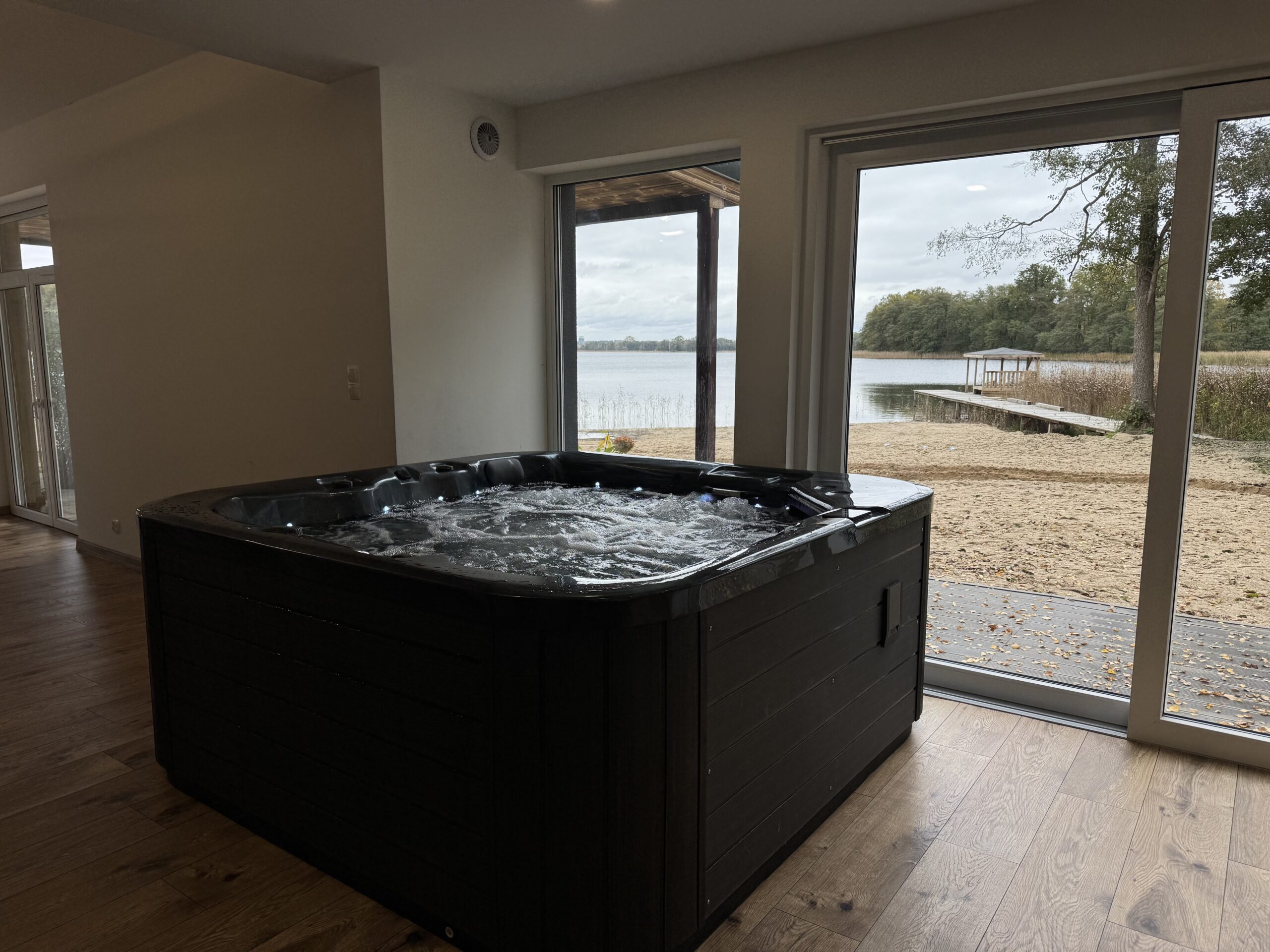 Cztery stylowe sypialnie zapewniają prywatność i wygodę, a łazienka z przeszkloną ścianą i wanną z hydromasażem pozwala zanurzyć się w relaksie z widokiem na jezioro. Dodatkowo do dyspozycji Gości pozostaje prywatne jacuzzi, sauna oraz bezpośredni dostęp do plaży i pomostu z altaną – idealnego miejsca na poranną kawę lub wieczorne wino przy szumie wody.