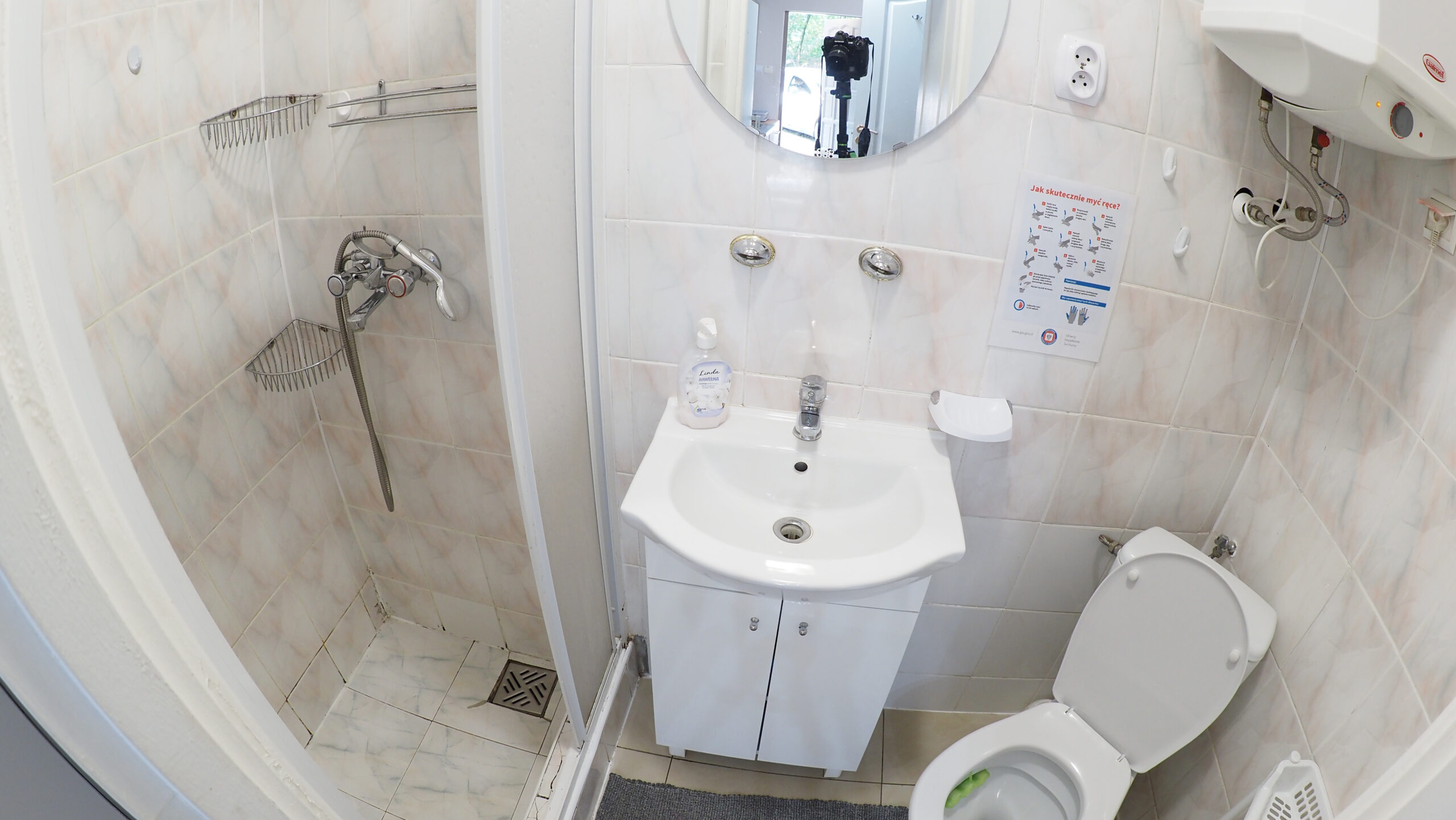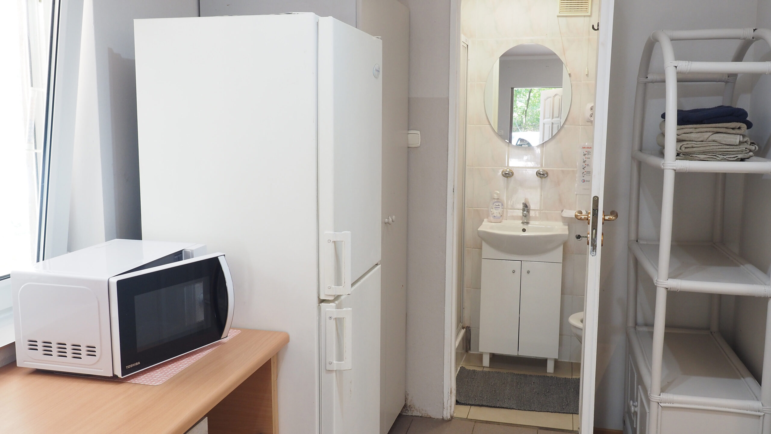 - Łazienka z prysznicem i ręcznikami