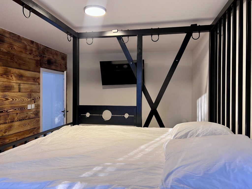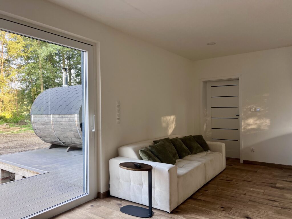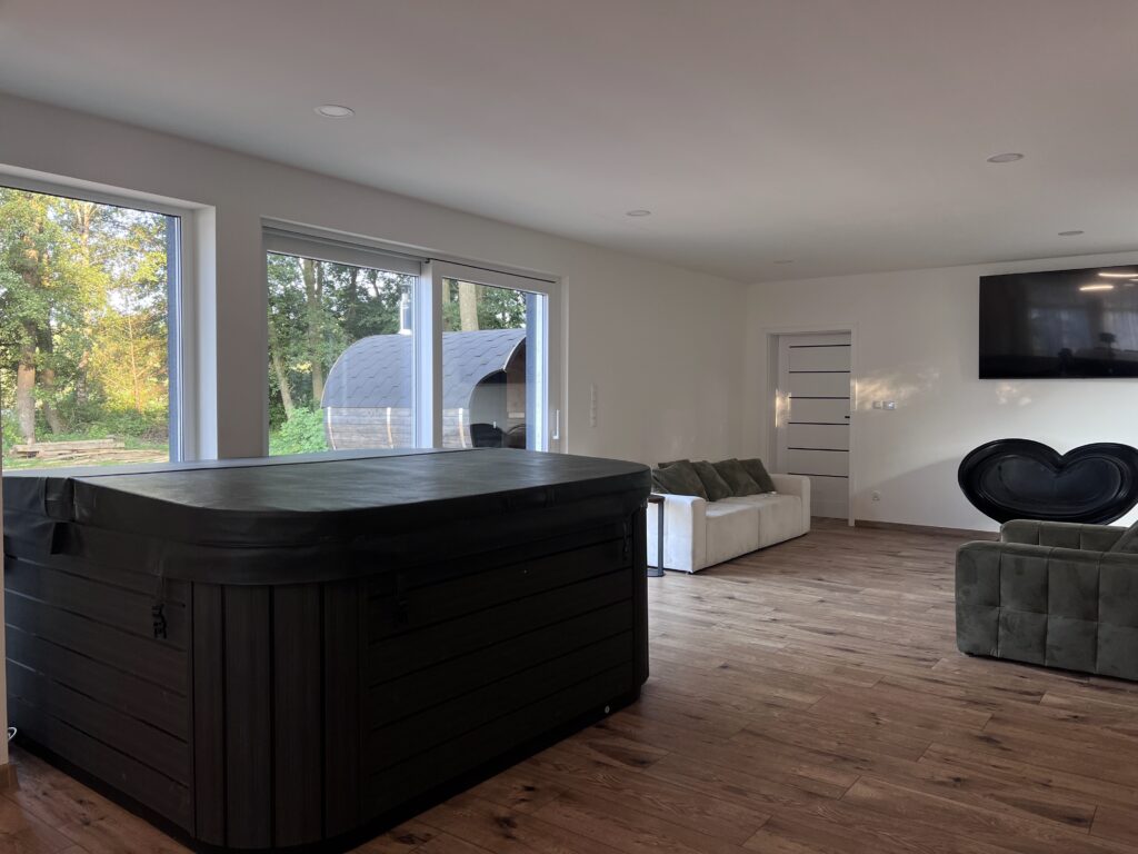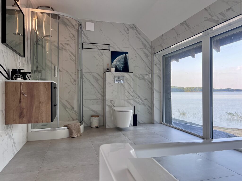 Inside, thoughtful design meets modern style. Four beautifully arranged bedrooms offer privacy and comfort, while the bathroom with a glass wall and hydromassage bathtub invites you to relax with a lake view. Guests also have access to a private jacuzzi, sauna, and direct lake access with a pier and gazebo — perfect for morning coffee or an evening glass of wine by the water.