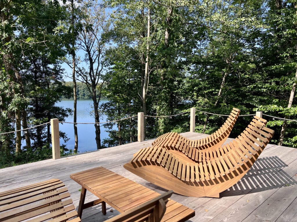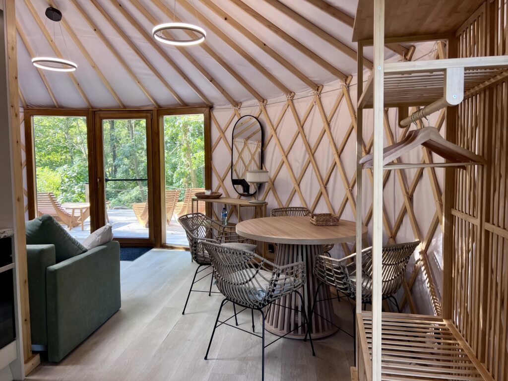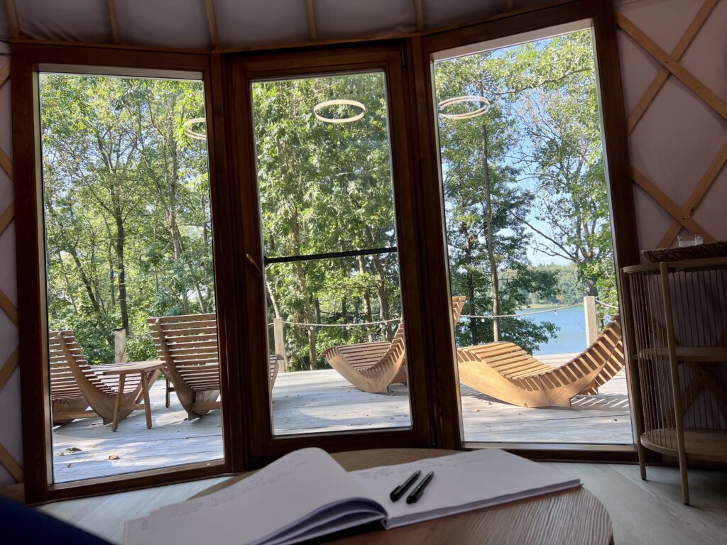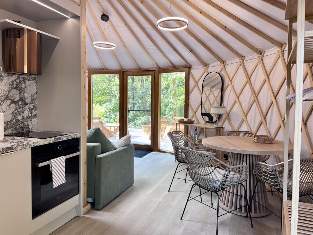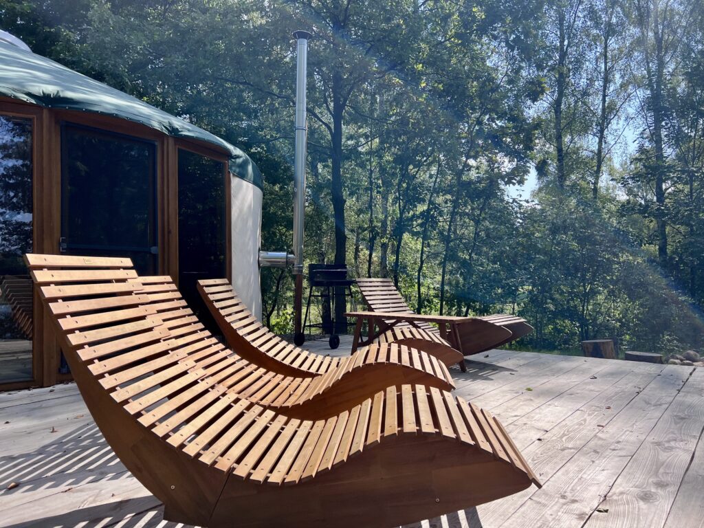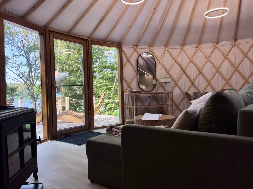 Luxury in the heart of nature. Yurt No. 2 is a blend of elegance, comfort, and closeness to nature. Situated in a spot ensuring complete privacy, it envelops you in silence and a calming view of Lake Wisola. The interior captivates with its sophisticated style – light fabrics, wood, and soft lighting create an atmosphere of harmony. The lounge area features a comfortable sofa and a fireplace that fills the space with pleasant warmth. An elevated bed with a skylight allows you to admire the sky at any time of day or night. Outside, guests have access to a private bonfire pit, grill, and sun loungers – perfect for moments of relaxation with a lake view.