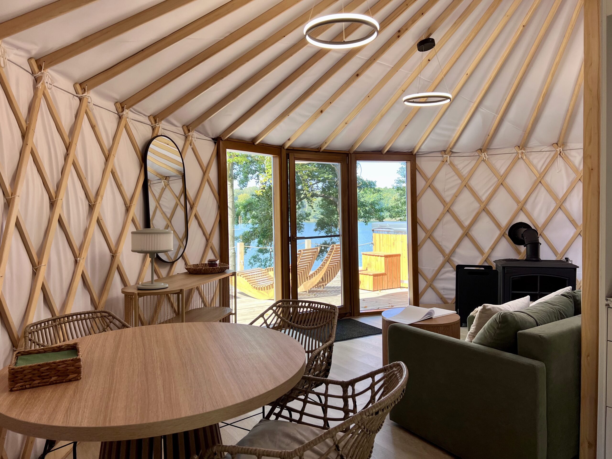 Nowoczesna jurta z widokiem na jezioro Wisola, prywatną jacuzzi.