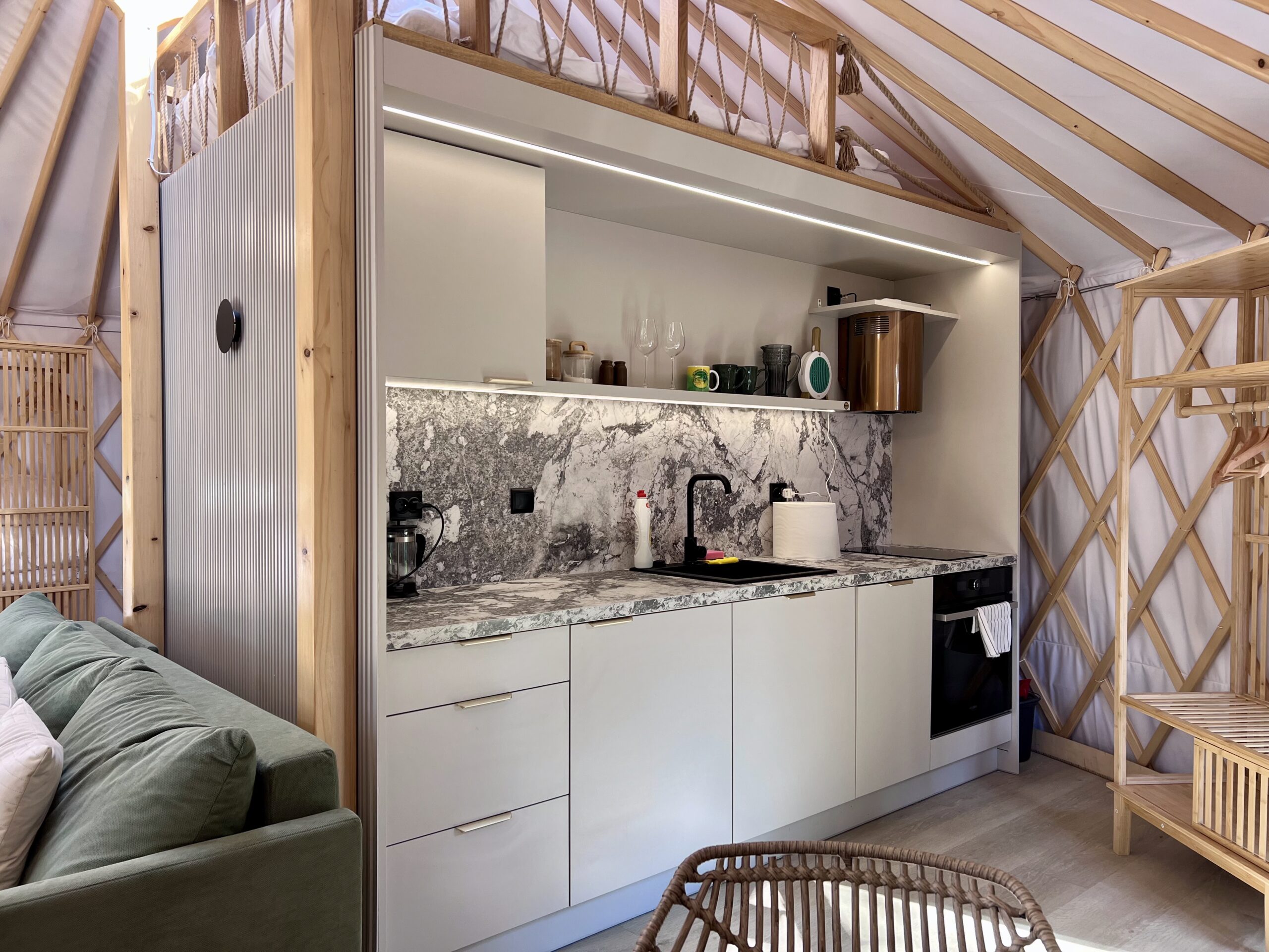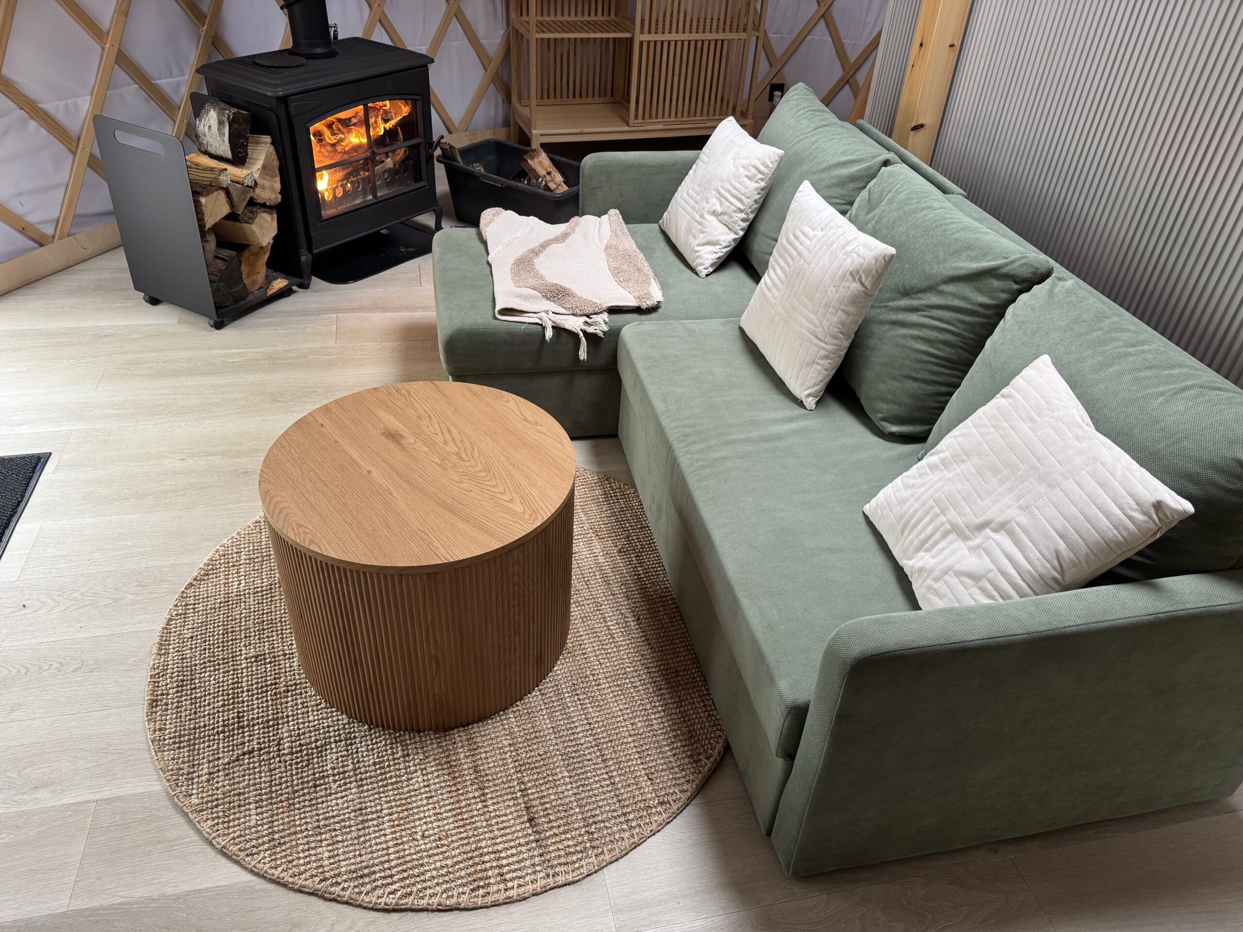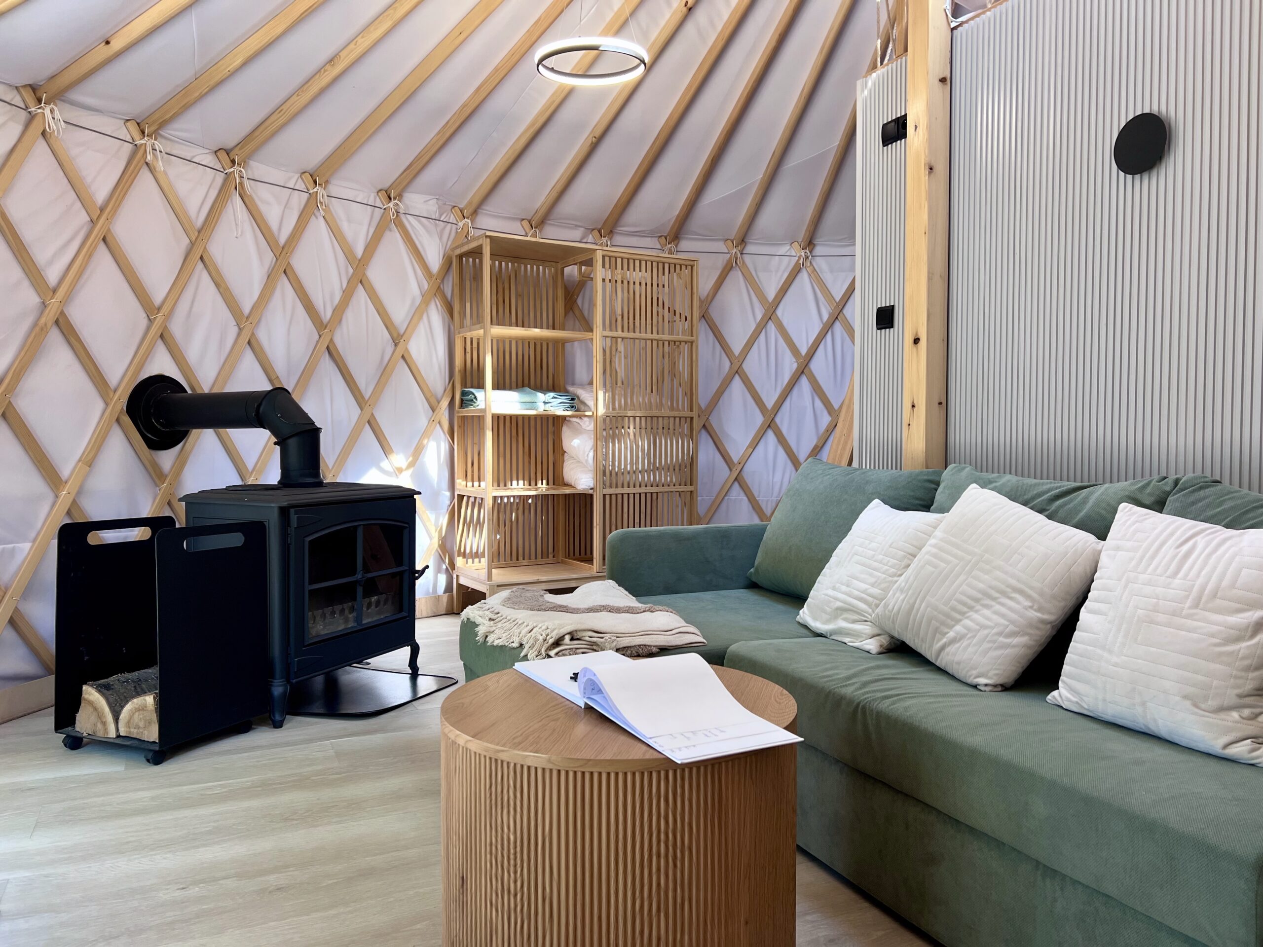 Wtopiona w ciszę natury, Jurta nr 1 to synonim luksusu i spokoju. Z tarasu rozciąga się urzekający widok na jezioro Wisola, a po zmroku blask gwiazd można podziwiać bezpośrednio z łóżka na podwyższeniu, przez świetlik w kopule. Wnętrze urzeka eleganckim designem, łączącym naturalne materiały z nowoczesnym komfortem. Na Gości czeka prywatna jacuzzi – idealna do odprężenia po dniu nad wodą. Kominek w strefie wypoczynkowej tworzy ciepłą, nastrojową atmosferę, a aneks kuchenny pozwala celebrować poranki przy aromatycznej kawie. Przed jurtą znajduje się prywatna strefa grillowa, miejsce na ognisko oraz leżaki – idealne do leniwego popołudnia w cieniu drzew.
