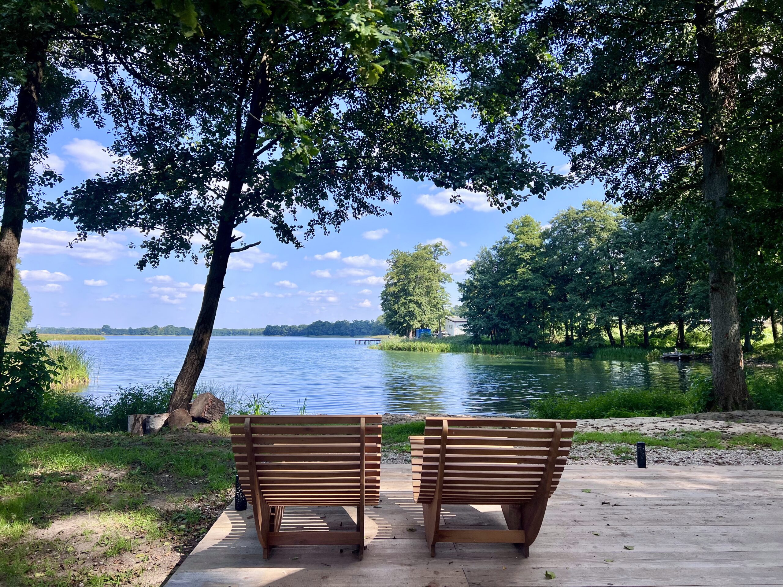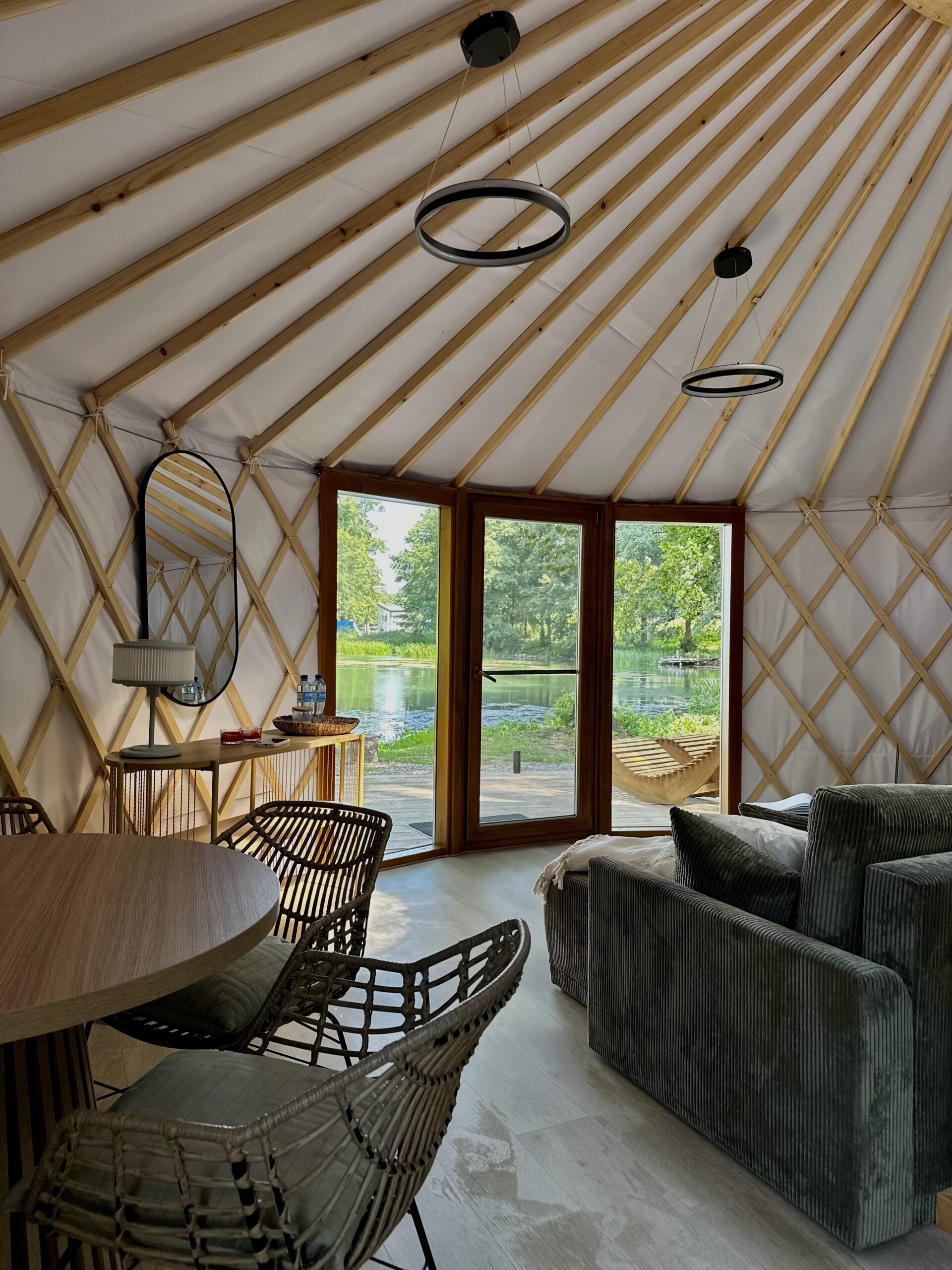 Jurta z panoramicznym widokiem na jezioro Wisola – elegancki azyl z kominkiem i tarasem.